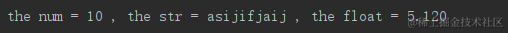 print("the num = %s , the str = %s , the float = %.3f" %(a , b , c))