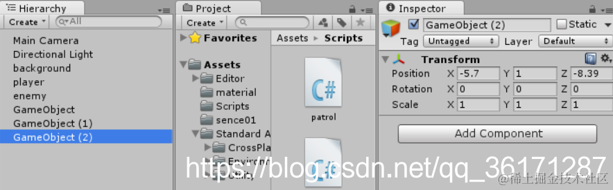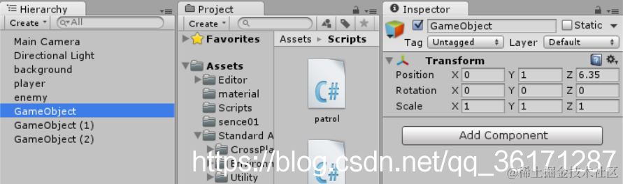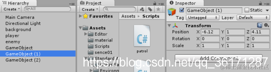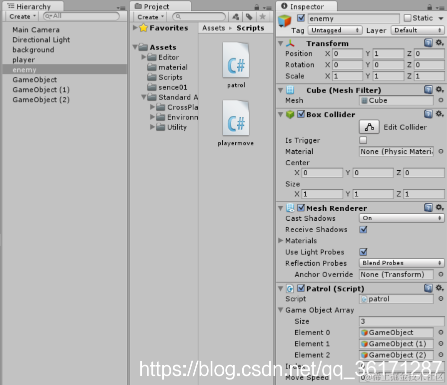 与创建player方块相同,创建enemy敌人方块。创建一个patrol脚本,将脚本拖动到enemy元件上。打开patrol,进行物体固定轨道移动的编码。