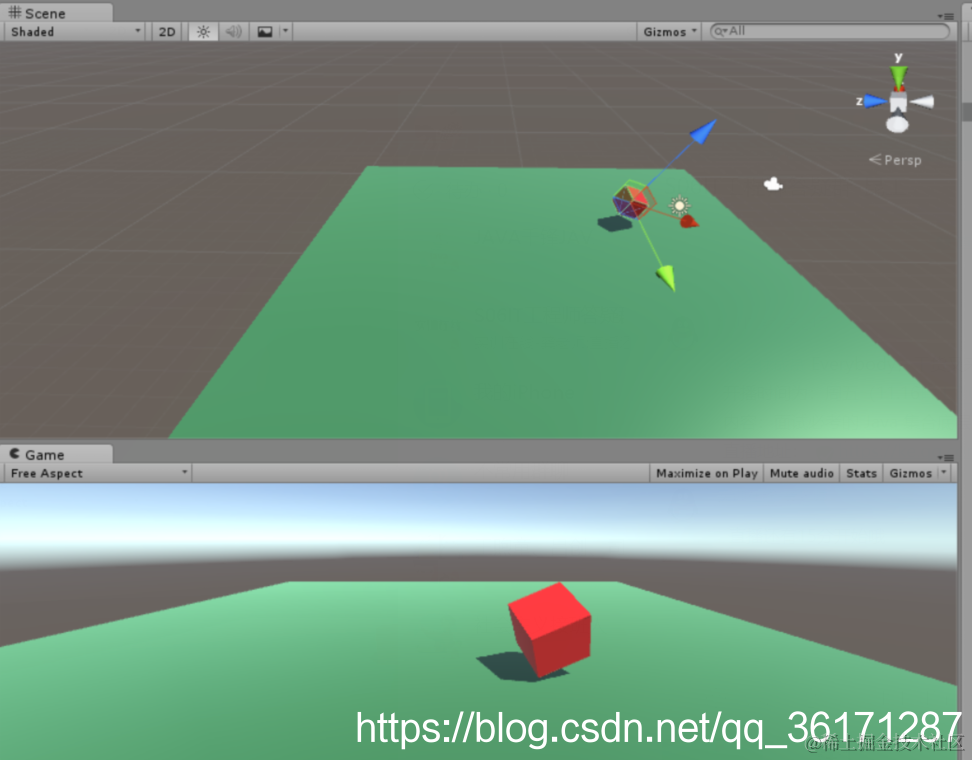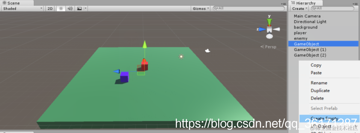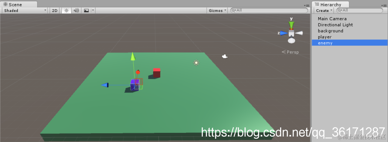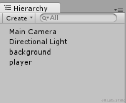一、在Hierarchy窗口中创建场景,之后塑造一个平面作为地板,将元件命名为background。再创建一个正方体,命名为player。