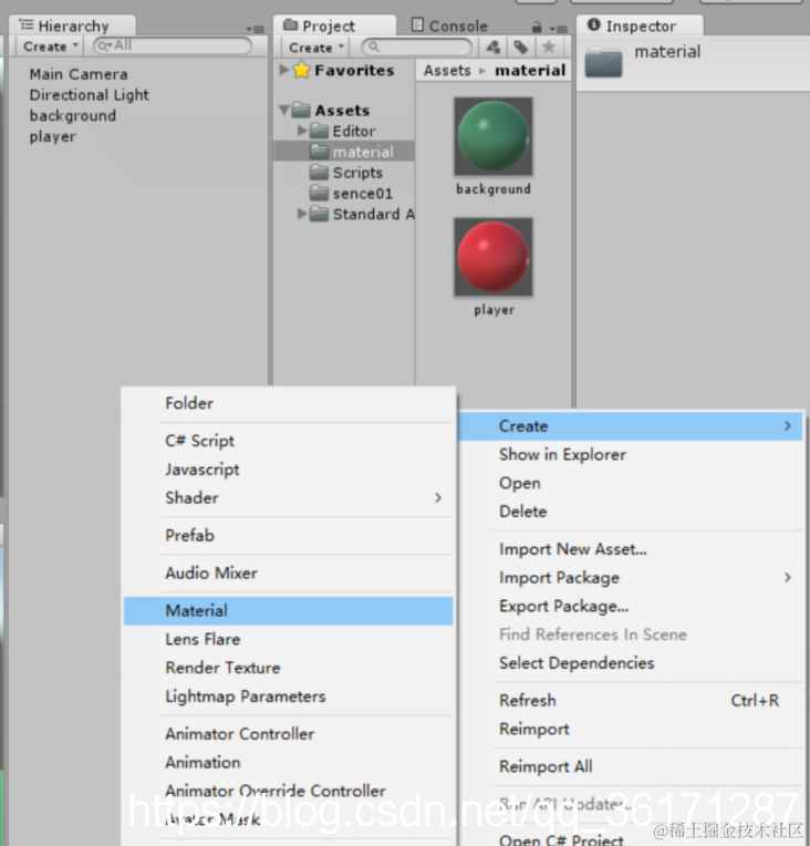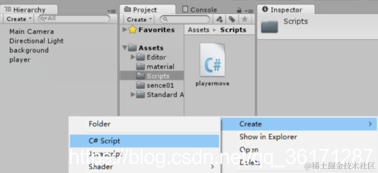在material文件夹中创建两个material,调整颜色,创建好之后直接拖动到player和background之上。在scripts文件夹中创建C# 脚本文件,命名为playermove。双击脚本文件,在VS中打开。