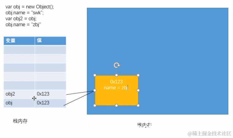 对象是保存到堆内存中的,每创建一个新的对象,就会在堆内存中开辟出一个新的空间,而变量保存的是对象的内存地址(对象的引用),如果两个变量保存的是同一个对象的引用,当通过一个变量修改属性时,另一个也会受到影响。