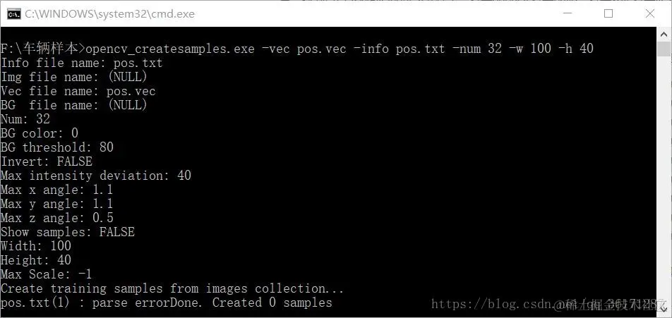 四、打开cmd,在该文件目录下输入“ opencv_createsamples.exe -vec pos.vec -info pos.txt -num 32 -w 100 -h 40 ” 。