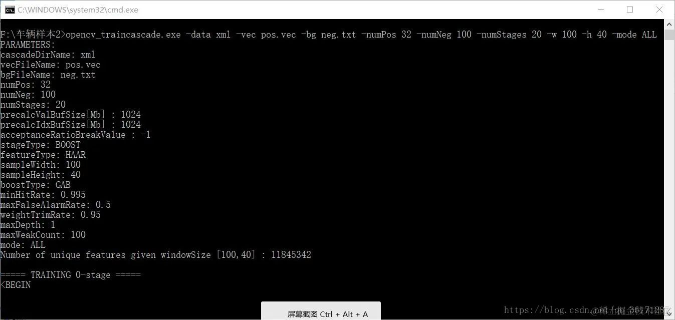 之后重复该步骤,cmd输入的语句换为“ opencv_createsamples.exe -vec neg.vec -info neg.txt -num 100 -w 100 -h 40 ”,产生neg.vec。