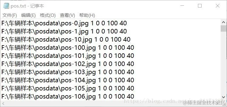 然后在里面输入“ dir /b/s/p/w *.jpg > pos.txt ”,将会在posdata文件夹中产生一个pos.txt的文档。打开pos.txt,选择编辑-替换,在查找中搜索jpg,替换为jpg 1 0 0 100 40,之后保存,将pos.txt复制到上一级目录中。