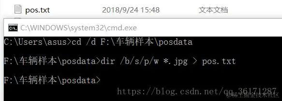 之后对negdata文件夹进行相同的操作,在cmd中输入的语句为“ dir /b/s/p/w *.jpg > neg.txt ”。