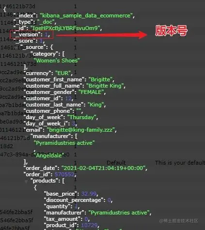 在 Mysql 中插入一条记录,我们直观显示的是一行记录。而 Elasticsearch 是文档型搜索引擎,我们直观看到的是一条 json 记录。如下图所示: