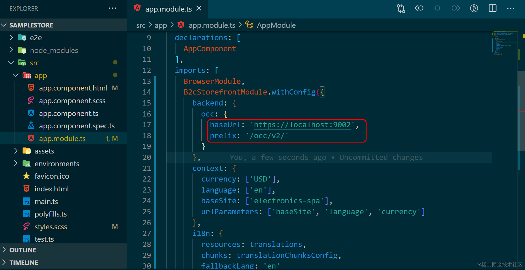 所有的命令行成功执行完毕后,打开 app.module.ts 文件,将配置节点 backend.occ.baseUrl 字段指定为我们本地安装的 SAP Commerce 实例即可: