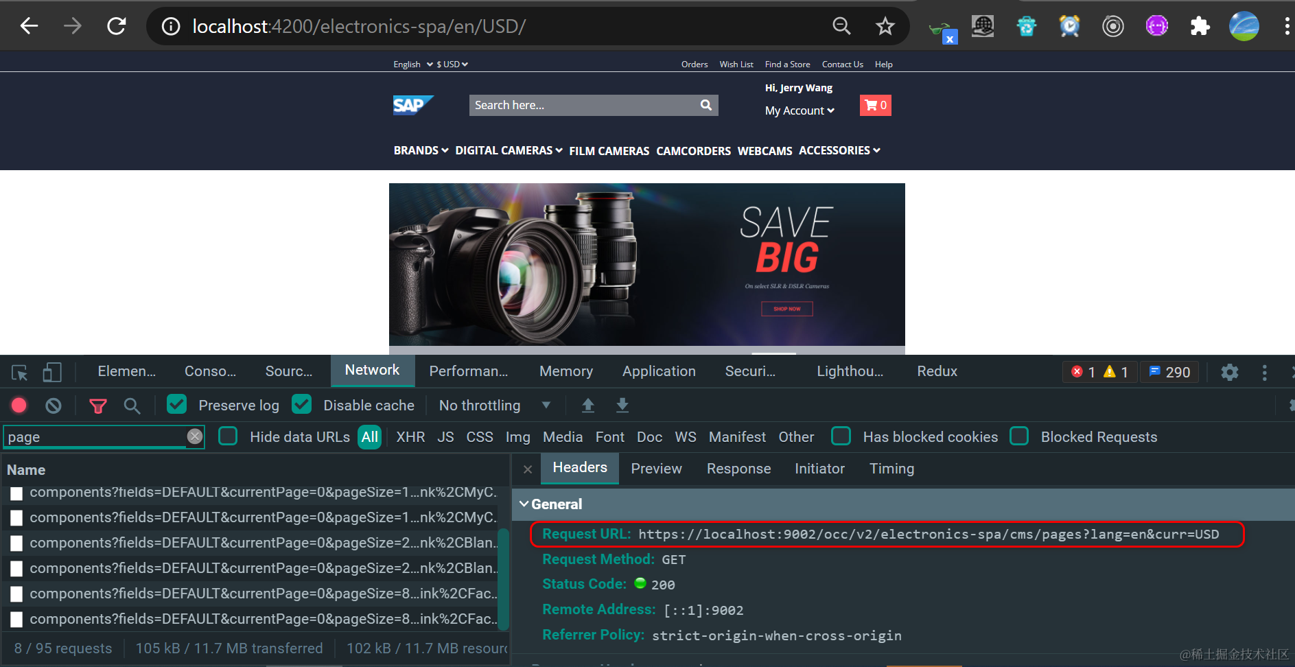 ng serve 命令启用这个安装好的 Angular 应用,在 Chrome 开发者工具 Network 标签里,能观察到 SAP Spartacus 的 Restful API 调用。