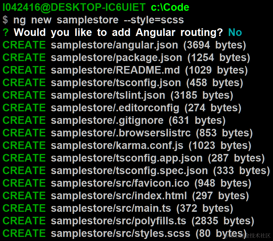 首先 ng new samplestore, 创建一个名为 samplestore 的 Angular 应用: