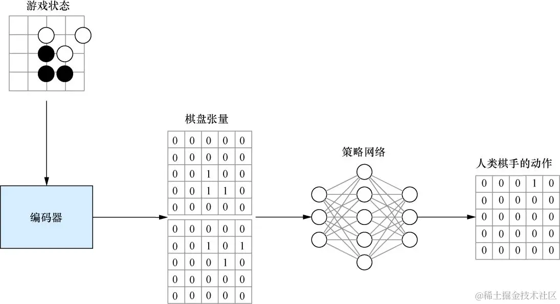 图13-4 AlphaGo的策略网络监督训练过程与第6章和第7章中介绍的完全一致。我们对人工棋谱进行复盘,并重新产生一系列游戏状态。每个游戏状态编码为一个张量(这个图展示了一个只有两个平面的张量,而AlphaGo实际使用了48个平面)。训练目标是一个与棋盘尺寸相同的向量,并在实际落子点填入1
