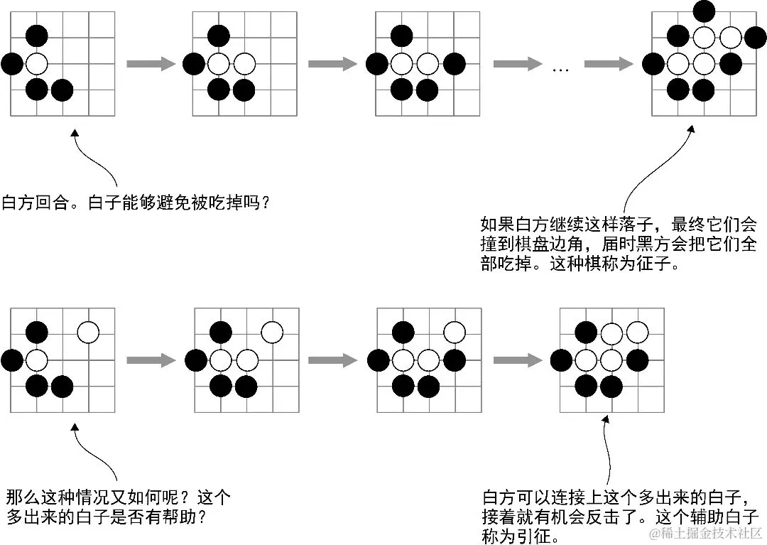 图13-3 AlphaGo将很多围棋策略概念直接编码到特征平面中,包括征子概念。在第一个例子中,白子只剩一口气了,这意味着黑方可以在下一回合吃掉它。白方可以长出来增加一口气,但是黑方也可以接着落子将白子的气减少为一口。这样一直持续下去,直到碰到棋盘边线,白子还是会被全部吃掉。而在另一种情况下,如果在征子的路线上已经有一颗白子,白方就有可能逃离被吃子的命运。AlphaGo中有一个特征平面专门用来表示征子是否能成功