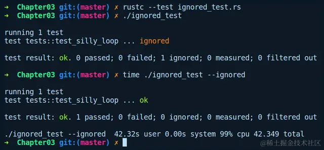 注意test_silly_loop函数上方的#[ignore]属性,下面是忽略测试后的输出结果: