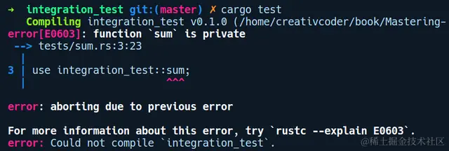 这个错误似乎很合理。我们希望程序库的用户调用sum函数,但是在程序库中却默认将其定义为私有的。因此,在sum函数之前添加pub修饰符,再次运行cargo test命令后,编译顺利通过: