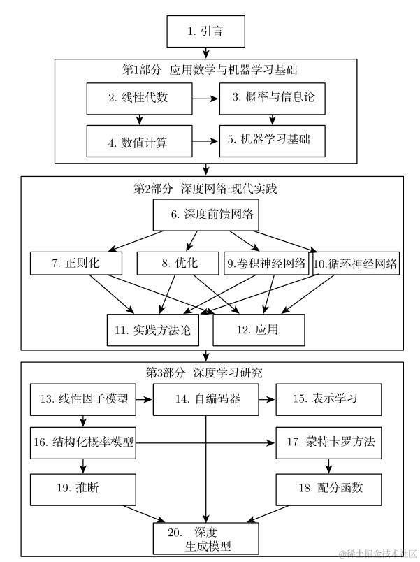 为什么这么说,先看看阅读《深度学习》所需要的数学知识。请看下图中的第1部分介绍基本的数学工具和机器学习的概念。