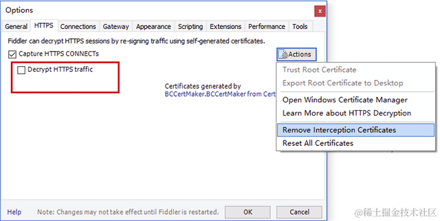 第1步:在Fiddler中删除证书。打开Fiddler,依次打开Tools→Options,取消选中Decrypt HTTP traffic,并且在Actions中单击“Remove Interception Certificates”,如图2-15所示。