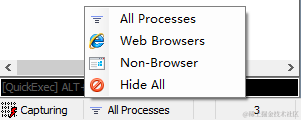 在状态栏中选择Web Browsers或者Non-Browser来选择进程,如图2-21所示。此外,工具栏中还有个按钮:Any Process,单击这个按钮把十字图标拖曳到想要抓包的程序上面,就只会抓特定进程的包,如图2-22所示。
