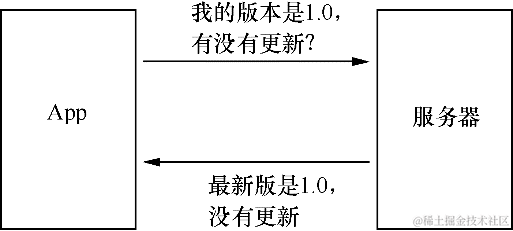 App升级的时候,App会发送一个HTTP请求,来问服务器有没有最新版。如图2-26所示,如果没有最新版,服务器返回的HTTP响应中会说没有更新。