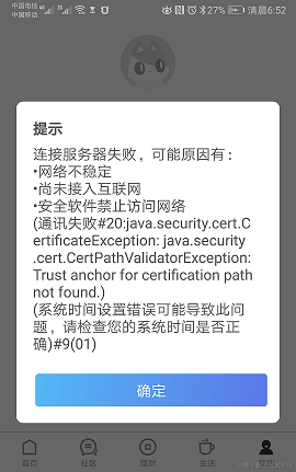 银行的App对安全性要求很高,所以一般不允许抓包。某款银行App在用Fiddler抓包的时候,App会提示网络错误,不让抓包,如图2-7所示。