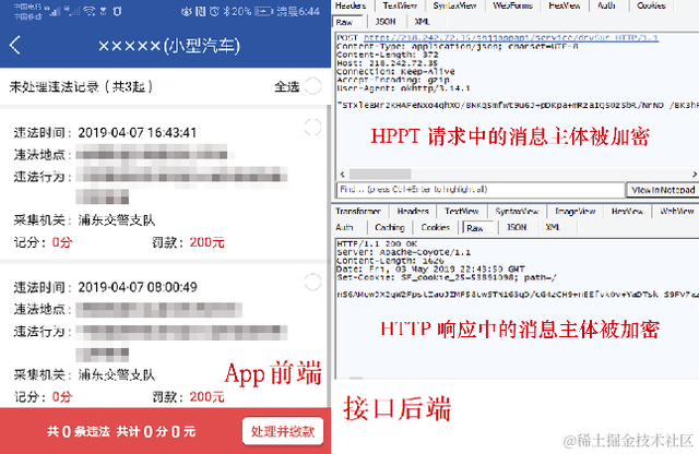 图2-6是一个查违章的App的抓包内容,可以看到这个App可以被抓包,但是其HTTP请求和HTTP响应全部被加密了,安全性很高。
