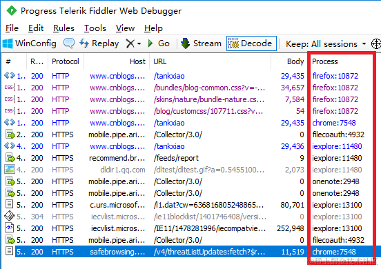 进程是计算机中程序的一次运行活动。Fiddler的Process列对应本地Windows进程。通过这一列我们可以知道是哪个进程在发包,如图2-24所示。