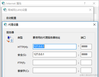 设置系统代理的打开方式为:控制面板→Internet选项→连接→局域网设置→代理服务器。