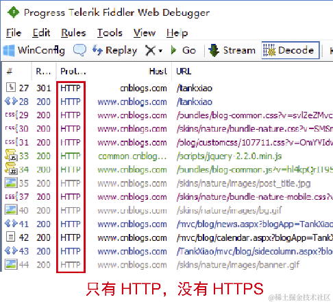 如果证书没有安装成功,那么Fiddler只能抓到HTTP请求,抓不到HTTPS请求,如图2-2所示。所以一定要想办法把证书安装好。