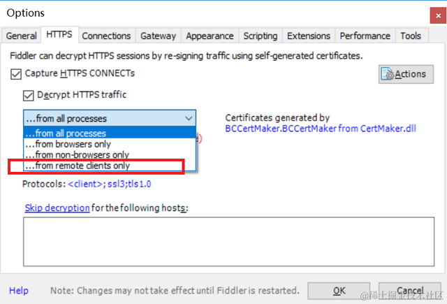 在专门抓App的包的时候,Fiddler里面混杂了本地计算机和手机App的包,如果只想抓手机App的包,这时候可以选择“…from remote clients only”,如图2-19所示。