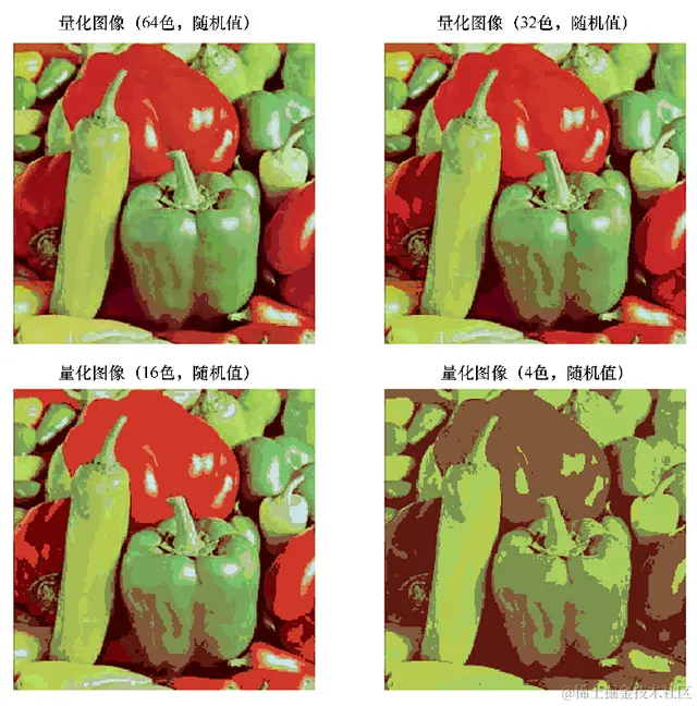 本节将演示如何对pepper图像执行像素矢量量化(VQ),将显示图像所需的颜色数量从250种减少到4种,同时保持整体外观质量。在本例中,像素在三维空间中表示,使用k均值查找4个颜色簇。