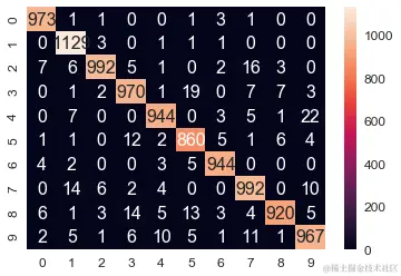运行上述代码,输出混淆矩阵,如图9-15所示。可以看到,虽然训练数据集的整体准确率达到96.9%,但仍存在一些错误分类的测试图像。