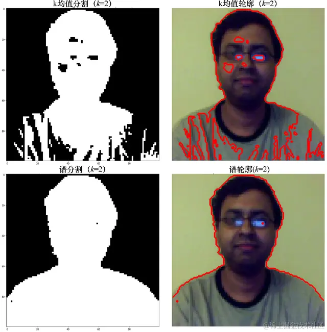 将使用谱聚类算法得到的图像分割结果与使用k均值聚类得到的二值分割结果进行对比,如下面的代码所示:
