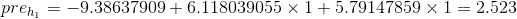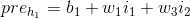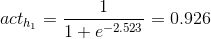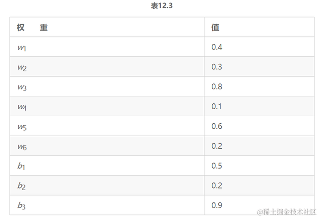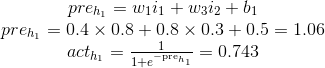 特征向量是[0.8,0.3],响应变量的真实值是0.5。让我们计算第一次向前传递的值,从隐单元h1开始。首先计算h1的预激活项,接着将逻辑S型曲线函数运用于预激活项计算激活项目,如公式12.7所示: