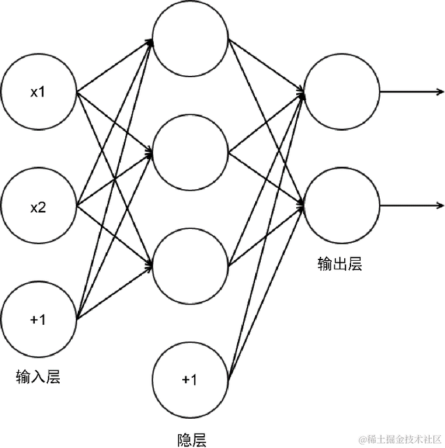多层感知机是一个简单的ANN。然而,它的名字是一种误称。一个多层感知机的并不是每一层只包含单一的感知机的多层结构,而是一个由人工神经元模拟感知机的多层结构。多层感知机包含3层或者更多层人工神经元,这些神经元形成了一个有向、非循环图。一般地,每层和后面的层都是全连接,一个层中的每个人工神经元的输出项或者说激活项,都是下一层中每个人工神经元的输入项。特征通过输入层进行输入。输入层中的简单神经元至少和一个隐层连接。隐层表示潜在变量,这些变量在训练数据中无法被观测到。隐层中隐藏神经元通常被称为隐单元。最后一个隐层和一个输出层连接,该层的激活项是响应变量的预测值。图12.2描述了一个包含3层感知机的多层感知机结构。标有 +1的神经元是常量偏差神经元,在大多数架构图中并不出现。这个神经网络有两个输入神经元,3个隐神经元以及2个输出神经元。