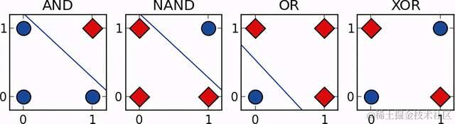 回顾第10章,虽然一些布尔函数例如AND、OR和NAND可以用感知机来逼近,线性不可分函数XOR却不能,如图12.1所示。