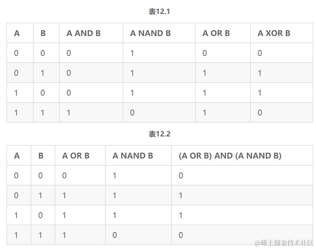 表12.1是关于输入A和输入B对于XOR函数、OR函数、AND函数和NAND函数的真实值表格。从这个表格中我们可以验证输入A和输入B经过OR函数的输出和NAND函数的输出再经过AND函数处理的输出结果,和直接经过XOR函数处理的输出结果相同,如表12.2所示。