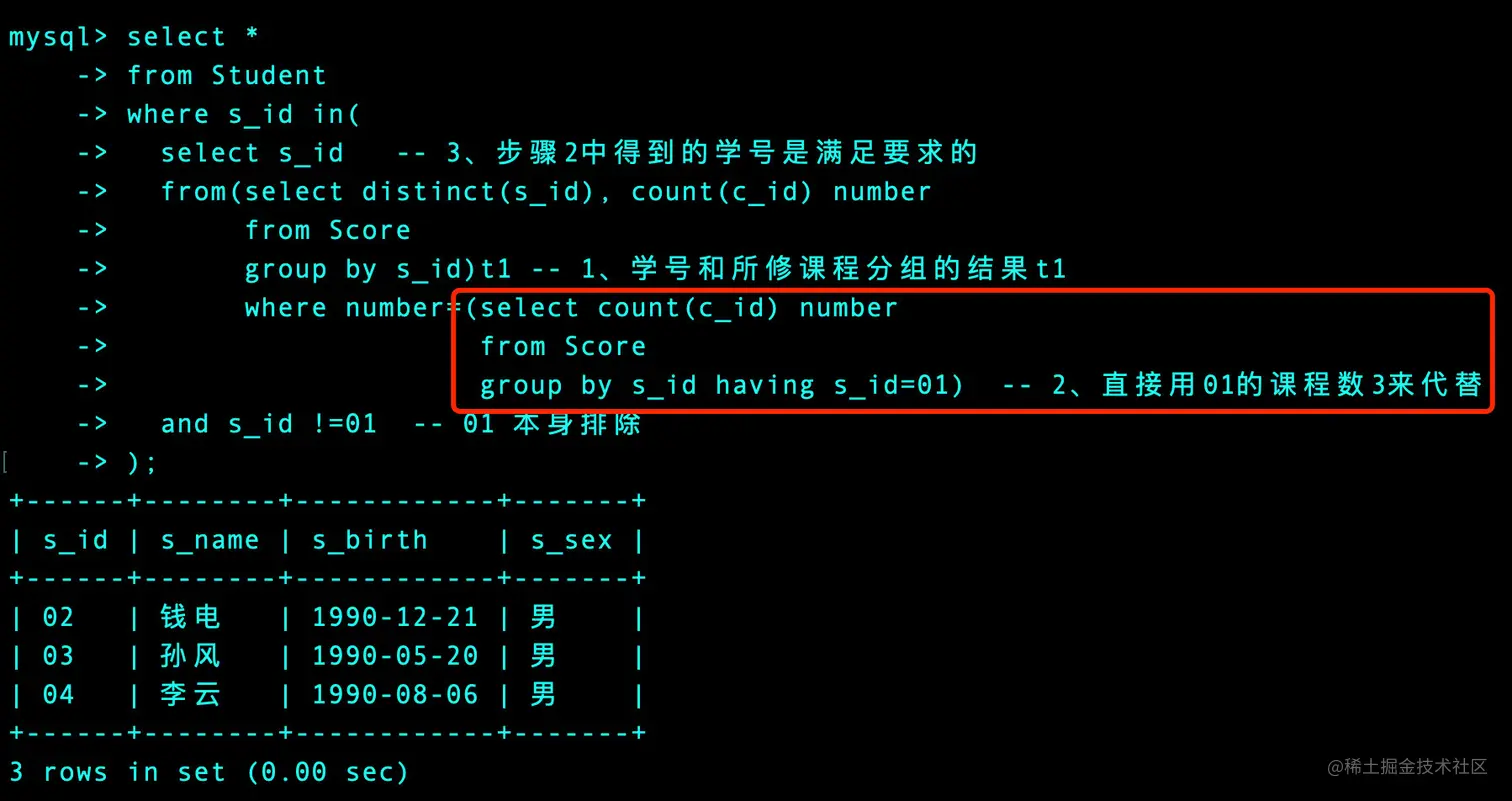 我们在上面的步骤2中不考虑直接指定3(where number=3),而是用01学生所修的课程数(虽然也是3)来代替: