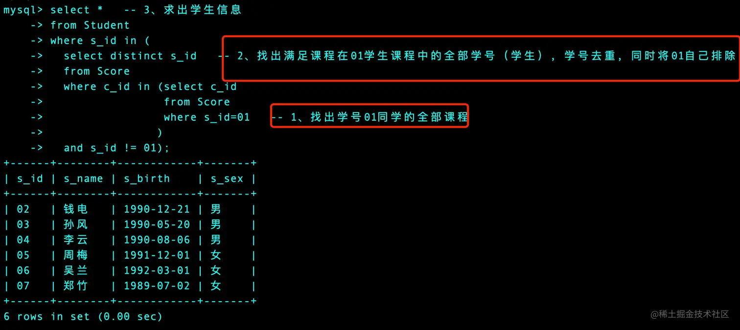 where s_id in (select s_id -- 3、步骤2中得到的学号是满足要求的