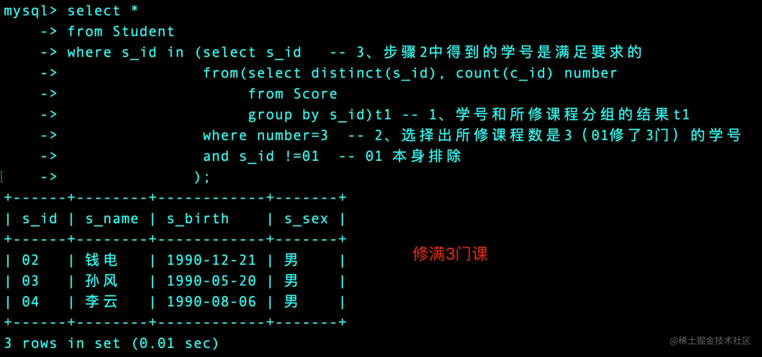 本题我们可以:因为总课程数3,而01号同学的课程数刚好是3,所以我们只要找出在Score表中课程也修满3门的同学即可