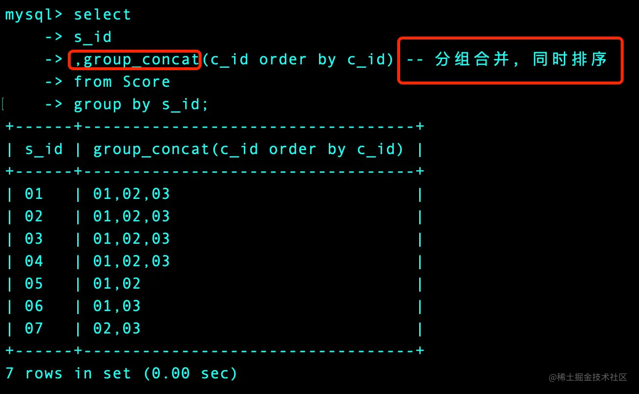,group_concat(c_id order by c_id) -- 分组合并,同时排序