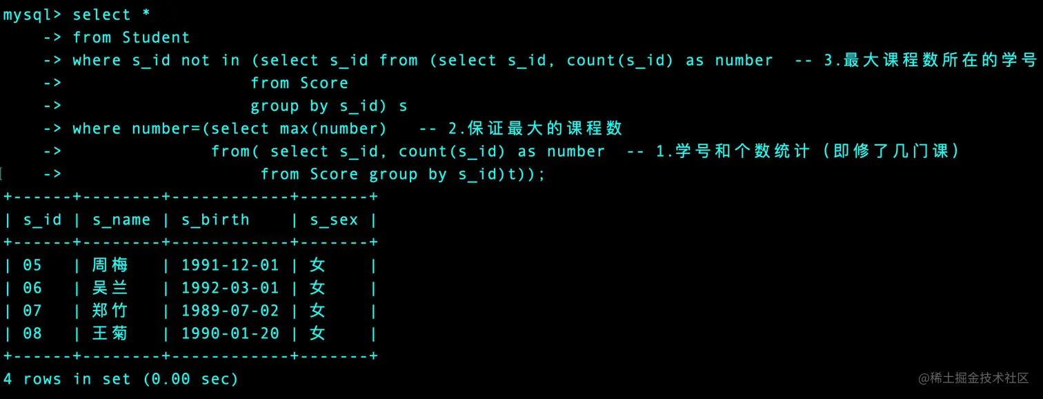 where s_id not in (select s_id from (select s_id, count(s_id) as number -- 3.最大课程数所在的学号需要排除