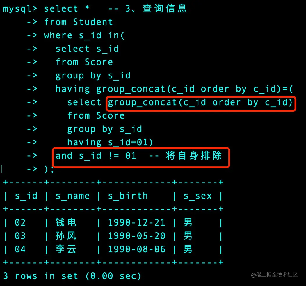 having group_concat(c_id order by c_id)=( -- 2、找出和01号学生分组合并结果相同的学号s_id;也需要排序