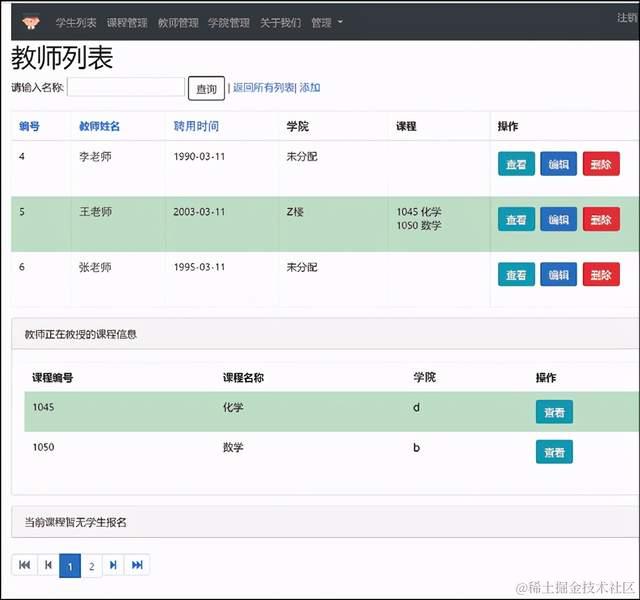 导航到http://localhost:13380/Teacher/Index/5?Sorting=Id&CurrentPage=1&courseID=1045可以看到完整的视图数据,页面如图37.2所示。