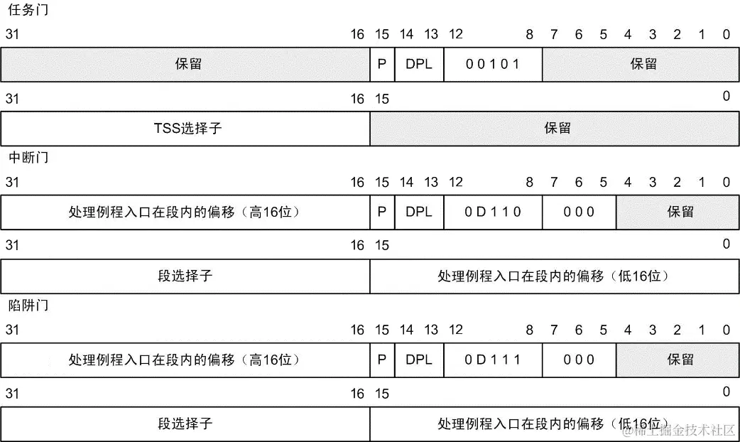 系统通过门描述符的类型字段,即高4字节的6~12位,来区分一个描述符的种类。例如任务门的类型是0b00101(b代表二进制数),中断门的类型是0b0D110,其中D位用来表示描述的是16位门(0)还是32位门(1),陷阱门的类型是0b0D111。
