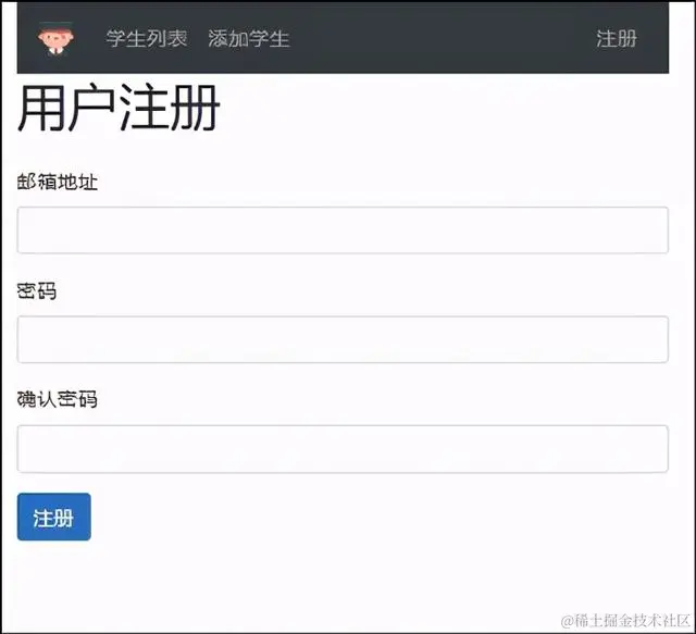 新用户注册视图应如图21.2所示。为了能够注册为新用户,需要邮箱地址和密码两个字段。