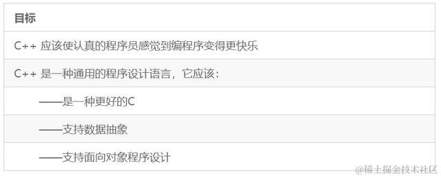 我的目标是提升系统程序设计中的抽象层次,其方式类似于C语言在取代汇编语言作为系统工作主流时的所作所为。有关新特征的想法都放在这一统一框架中考虑,看它们在将C++ 提升为一种表述设计的语言时能起到什么作用。特别是对个别特征的考虑,就要看它能否形成一种可以通过类进行有效表述的概念。对于C++ 支持数据抽象和面向对象的程序设计,这是最关键的问题。