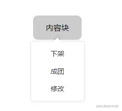 .box_main { position: relative; margin: 100px; width: 100px; height: 50px; } .content { width: 100px; height: 50px; line-height: 50px; text-align: center; font-size: 16px; background: #ccc; border-radius: 10px; } .dialogue { position: absolute; z-index: 1; top: 38px; left: 50%; margin-left: -54.5px; box-shadow: 0px 0px 5px 0px rgba(0, 0, 0, 0.2); text-align: center; padding: 7px 0; box-sizing: border-box; border-radius: 5px; width: 109px; list-style-type: none; background: #fff; } .dialogue li { padding: 11px 0; color: #333; font-size: 14px; white-space: nowrap; border: 0; outline: 0; line-height: 1; background: #fff; } .dialogue::after { content: ""; position: absolute; width: 12px; height: 12px; top: -6px; right: 0; left: 0; margin: auto; background: #fff; transform: rotate(45deg); box-shadow: -2px -2px 5px -1px rgba(0, 0, 0, 0.2); }