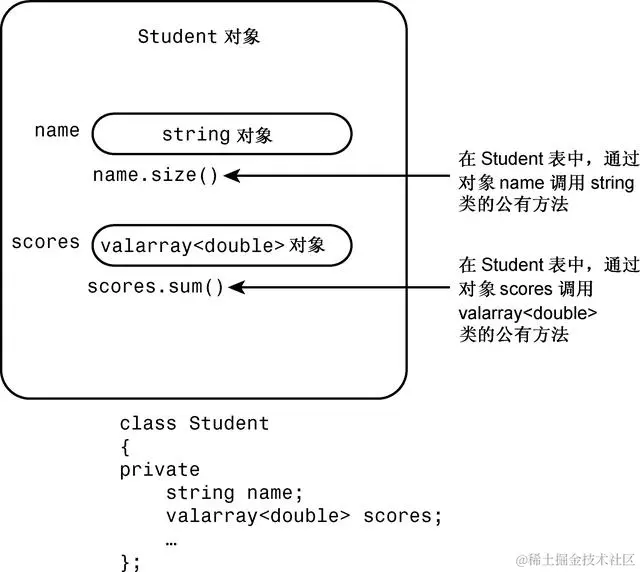 同样,上述类将数据成员声明为私有的。这意味着Student类的成员函数可以使用string和valarray<double>类的公有接口来访问和修改name和scores对象,但在类的外面不能这样做,而只能通过Student类的公有接口访问name和score(请参见图14.1)。对于这种情况,通常被描述为Student类获得了其成员对象的实现,但没有继承接口。例如,Student对象使用string的实现,而不是char * name或char name [26]实现来保存姓名。但Student对象并不是天生就有使用函数string operator+=()的能力。
