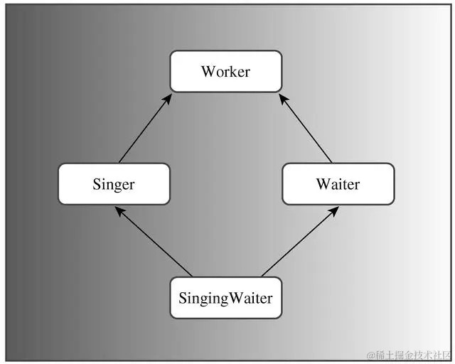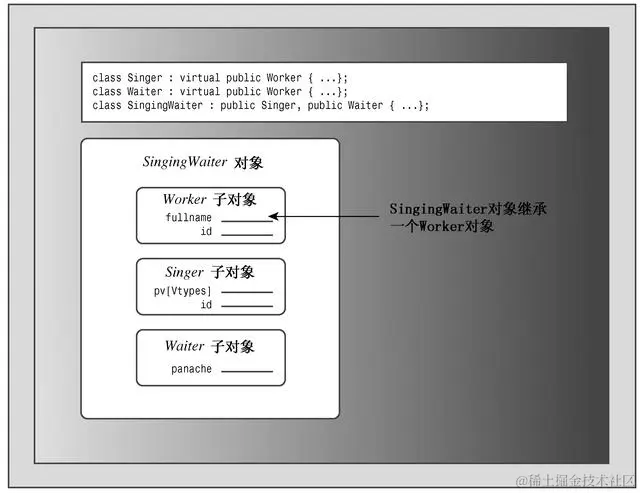 包含两个Worker对象拷贝还会导致其他的问题。然而,真正的问题是:为什么需要Worker对象的两个拷贝?唱歌的侍者和其他Worker对象一样,也应只包含一个姓名和一个ID。C++引入多重继承的同时,引入了一种新技术——虚基类(virtual base class),使MI成为可能。