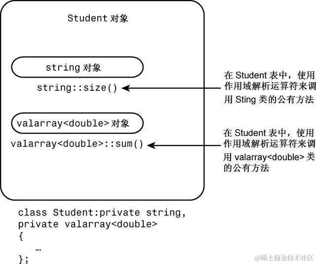 至此,已经确定了Student类的设计计划:使用一个string对象来表示姓名,使用一个valarray<double>来表示考试分数。那么如何设计呢?您可能想以公有的方式从这两个类派生出Student类,这将是多重公有继承,C++允许这样做,但在这里并不合适,因为学生与这些类之间的关系不是is-a模型。学生不是姓名,也不是一组考试成绩。这里的关系是has-a,学生有姓名,也有一组考试分数。通常,用于建立has-a关系的C++技术是组合(包含),即创建一个包含其他类对象的类。例如,可以将Student类声明为如下所示: