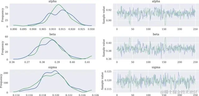 3个估算值都相当接近原始值(4,2,2)。不过,整个过程会得到许多估算值。最好用轨迹图(如图 13-20 所示)描述它们。轨迹图展示了不同参数得到的后验分布以及每个样本的单独估算值。后验分布帮助我们直观地了解了估算值中的不确定性: