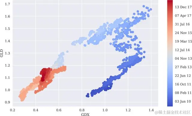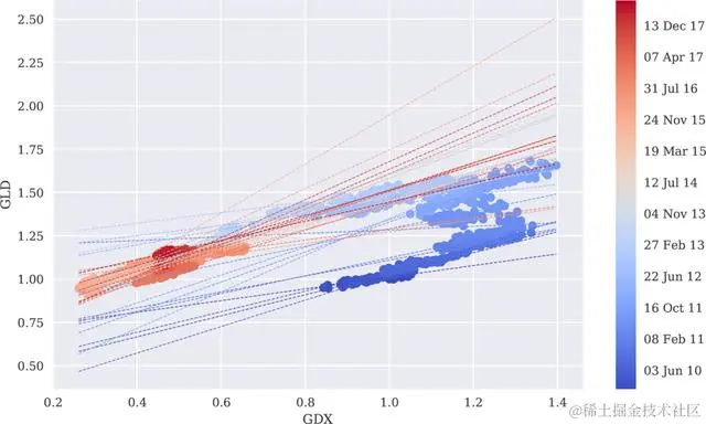 图13-21 穿过GDX和GLD数据的多条贝叶斯回归线